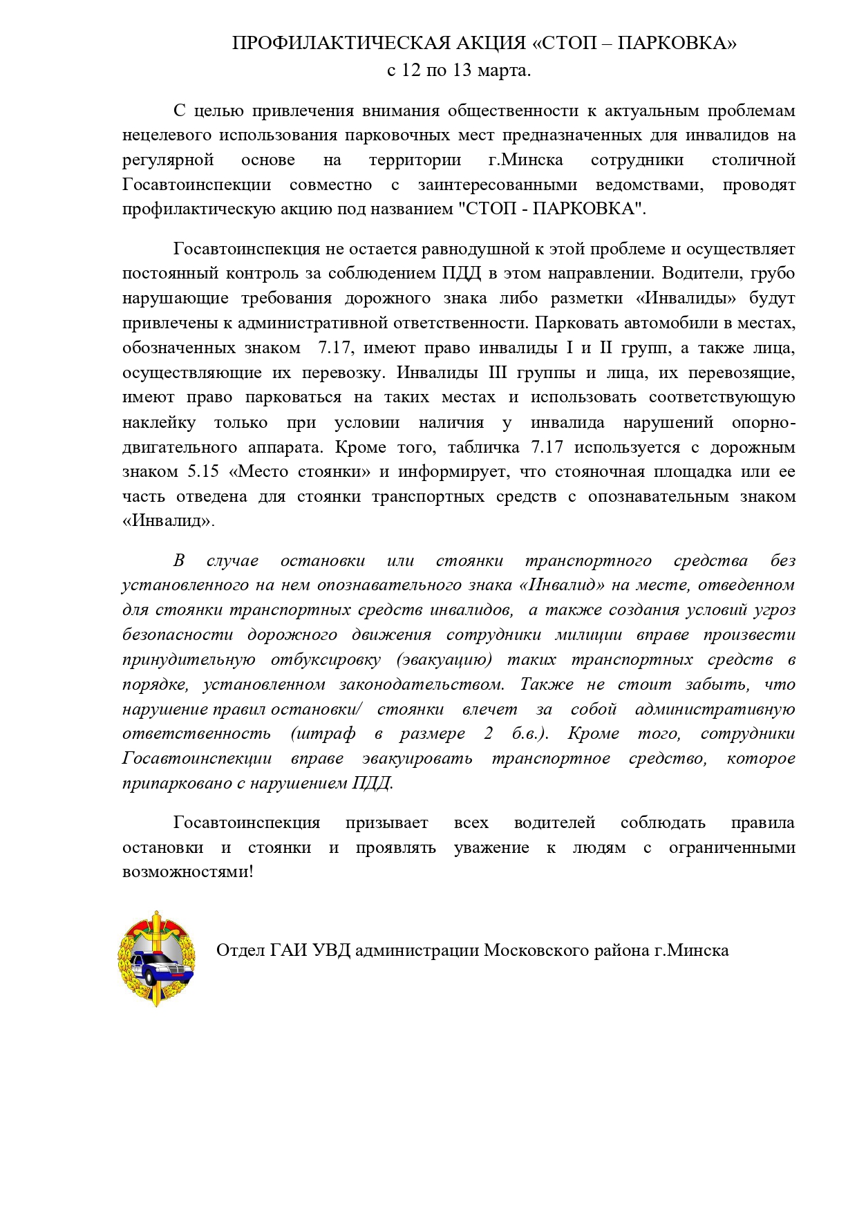 Профилактическая акция «стоп – парковка»